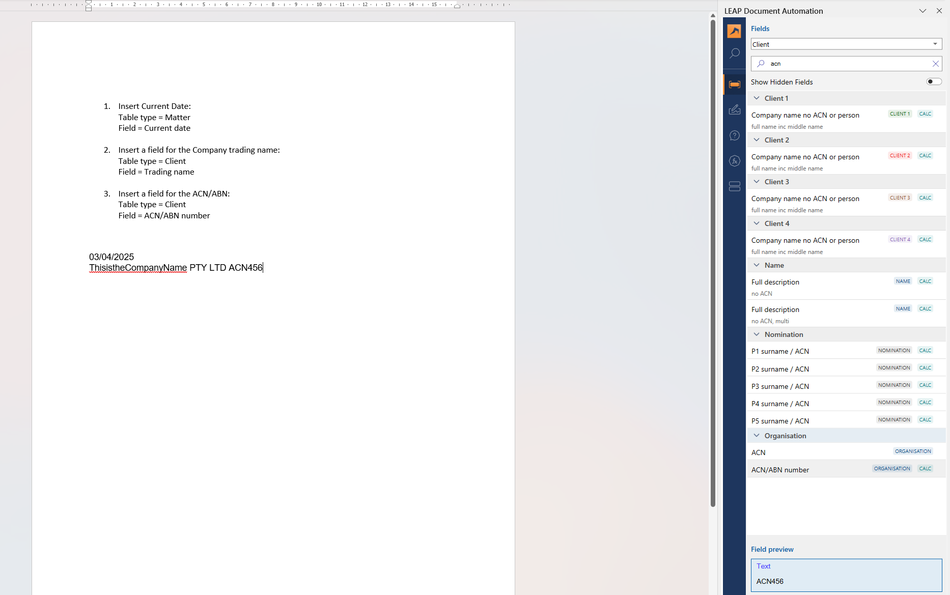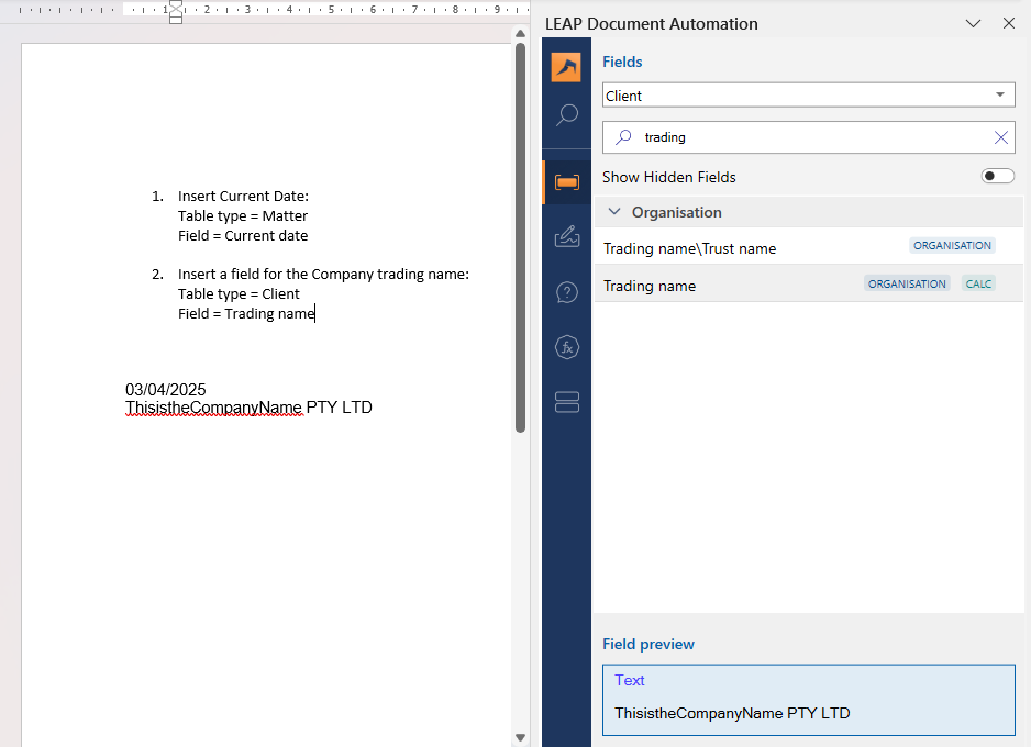 Inserting Fields into a Template for Use Across Multiple Matters