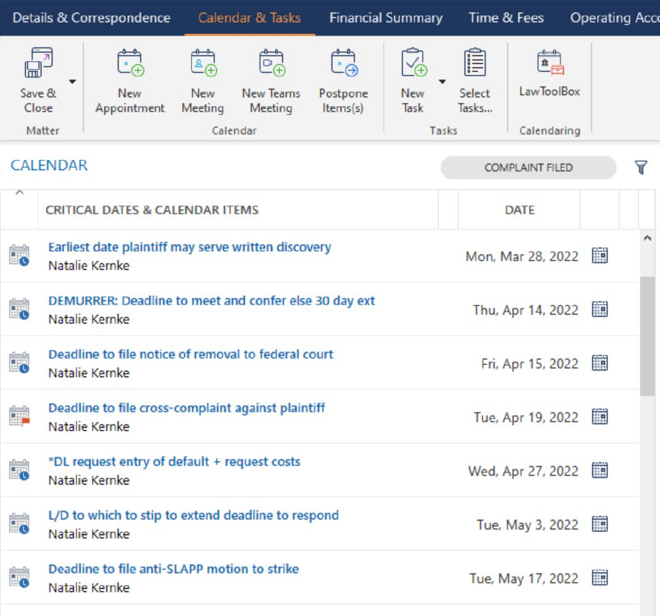 - When a Trial Date, hearing or other date is rescheduled all the deadlines automatically update in calendars.
