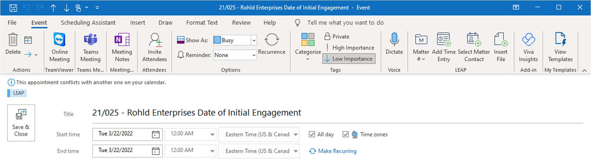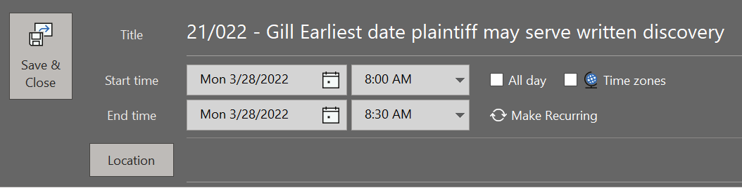 Deadlines calculated by LawToolBox in LEAP are added to the LEAP matter record and the Outlook calendar. Users can edit the deadlines from either location and then add additional team members to those deadlines. All future edits to those deadlines will be visible to all added members.
